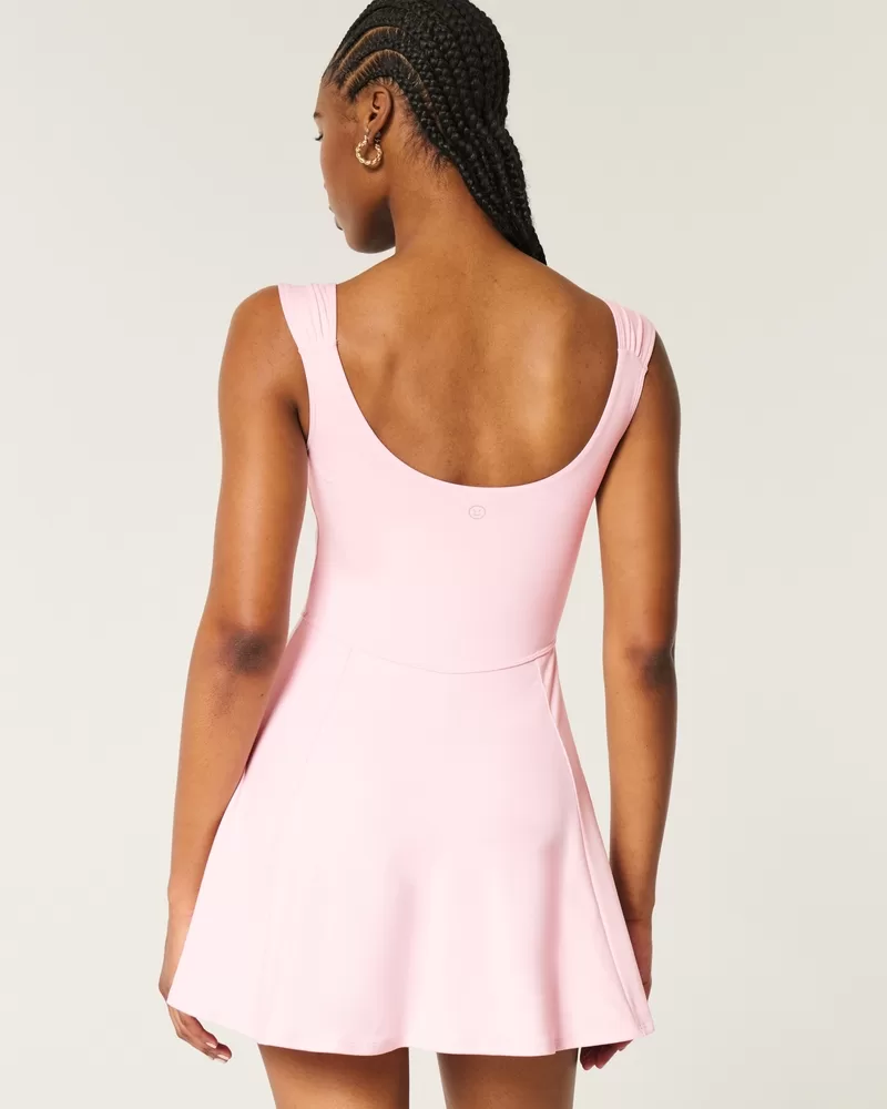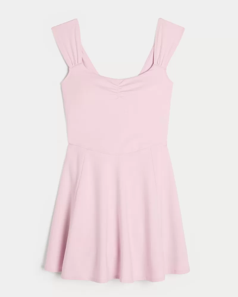 Your new fave dress is made with super soft active fabric and features a built-in shelf bra with removable pads. Built-in shorts with pocket, front cinch detail. Imported.