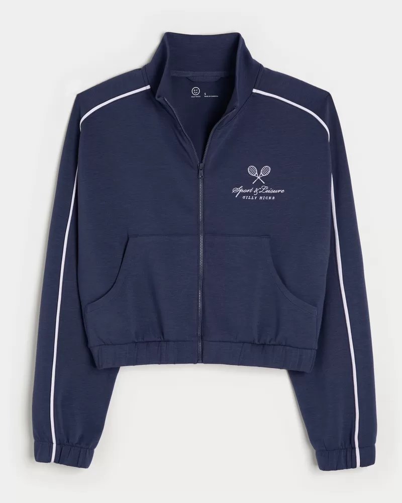 An ultra-comfortable track jacket in our super soft Cooldown fabric, designed with a full zip-up closure, mock neckline, front pockets and cropped length.