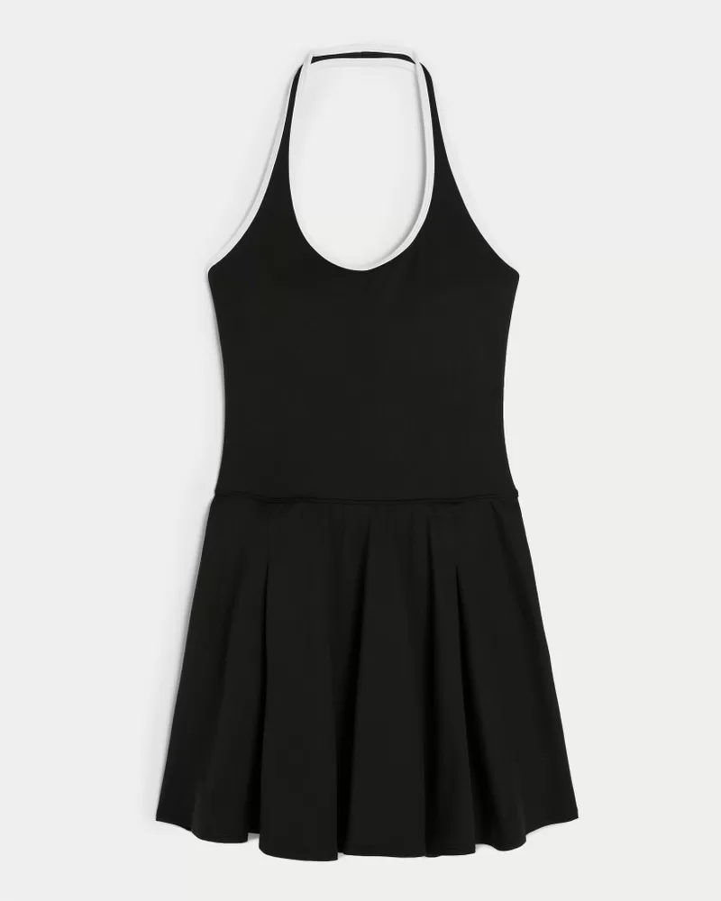Your new fave dress is designed with a pleated skirt and halter straps. Built-in shelf bra with pads, bathroom-friendly shorts with a pocket. Imported.