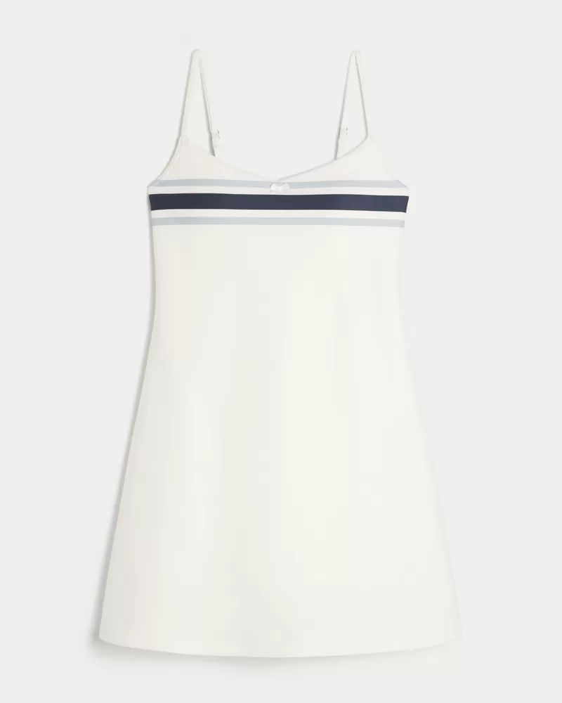 An ultra-comfortable active dress designed in our breathable, 4-way stretch, moisture-wicking Recharge fabric with a super soft, brushed feel. Slim silhouette, built-in shelf bra with removable pads, built-in bathroom-friendly shorts with pocket. Cute bow detail at neckline, adjustable straps. Imported.