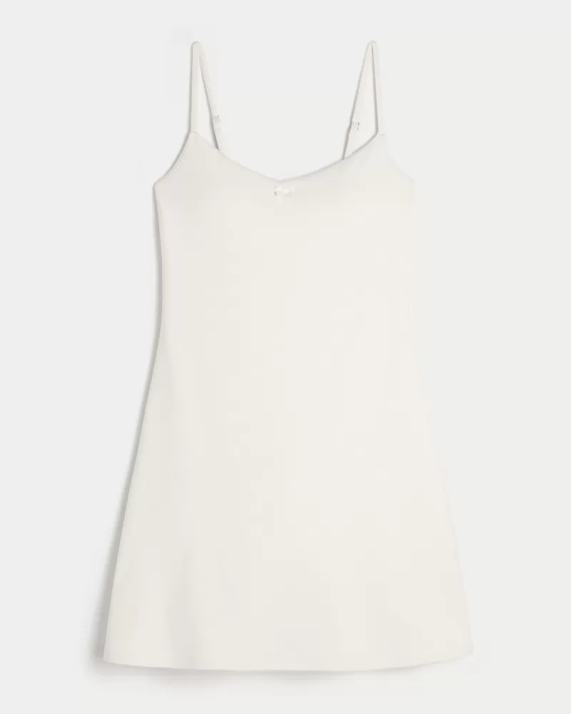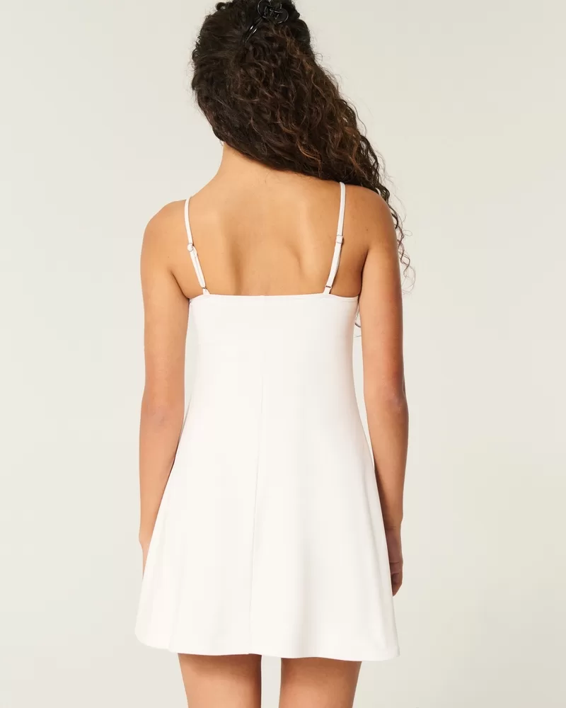 An ultra-comfortable active gameday dress designed in our breathable, 4-way stretch, moisture-wicking Recharge fabric with a super soft, brushed feel. Built-in shelf bra with removable pads, built-in bathroom-friendly shorts with pocket. Cute bow detail at neckline, adjustable straps. Imported.