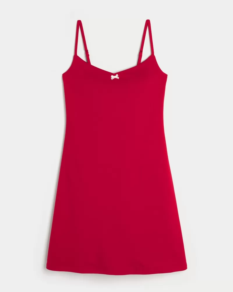 An ultra-comfortable active gameday dress designed in our breathable, 4-way stretch, moisture-wicking Recharge fabric with a super soft, brushed feel. Built-in shelf bra with removable pads, built-in bathroom-friendly shorts with pocket. Cute bow detail at neckline, adjustable straps. Imported.