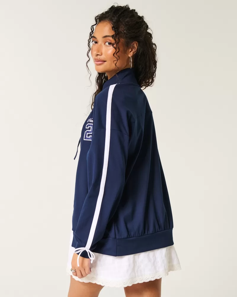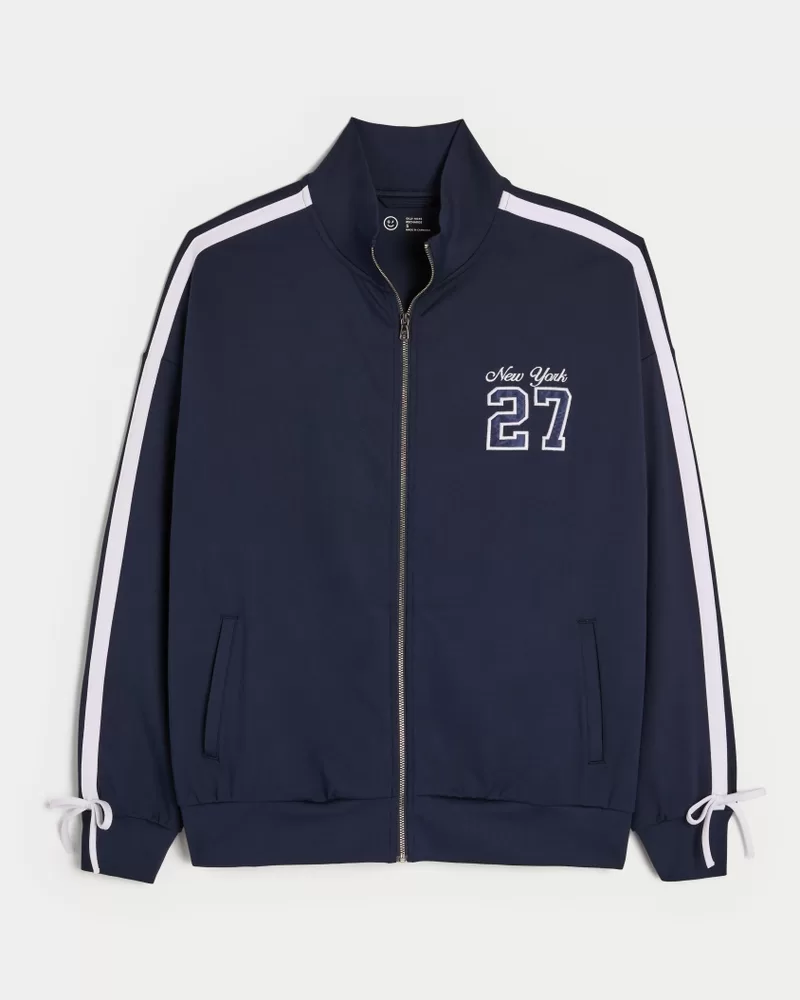 Designed in our breathable, 4-way stretch, moisture-wicking Recharge fabric with a super soft, brushed feel. This cute track jacket features a full zip-up closure and New York graphic embroidery at the left chest. Front pockets, tie details at the sleeves, tipped details. Imported.