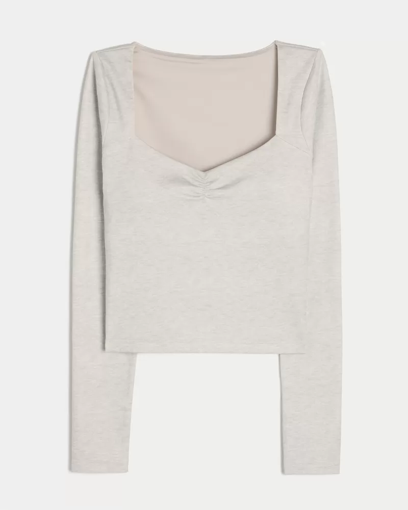 This super cute top is designed in our breathable, 4-way stretch, moisture-wicking Recharge fabric with a super soft, brushed feel. Sweetheart neckline with ruched detail, long sleeves, built-in shelf bra with removable pads. Long sleeves, thumb openings. Imported.