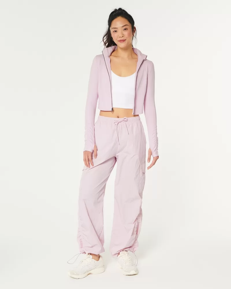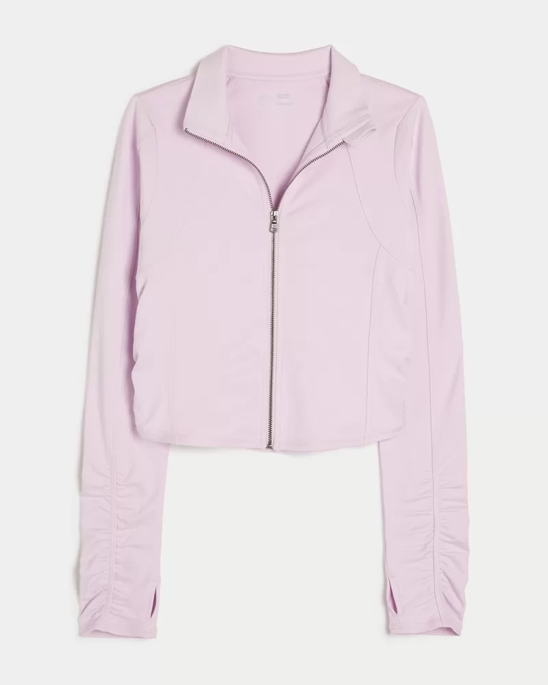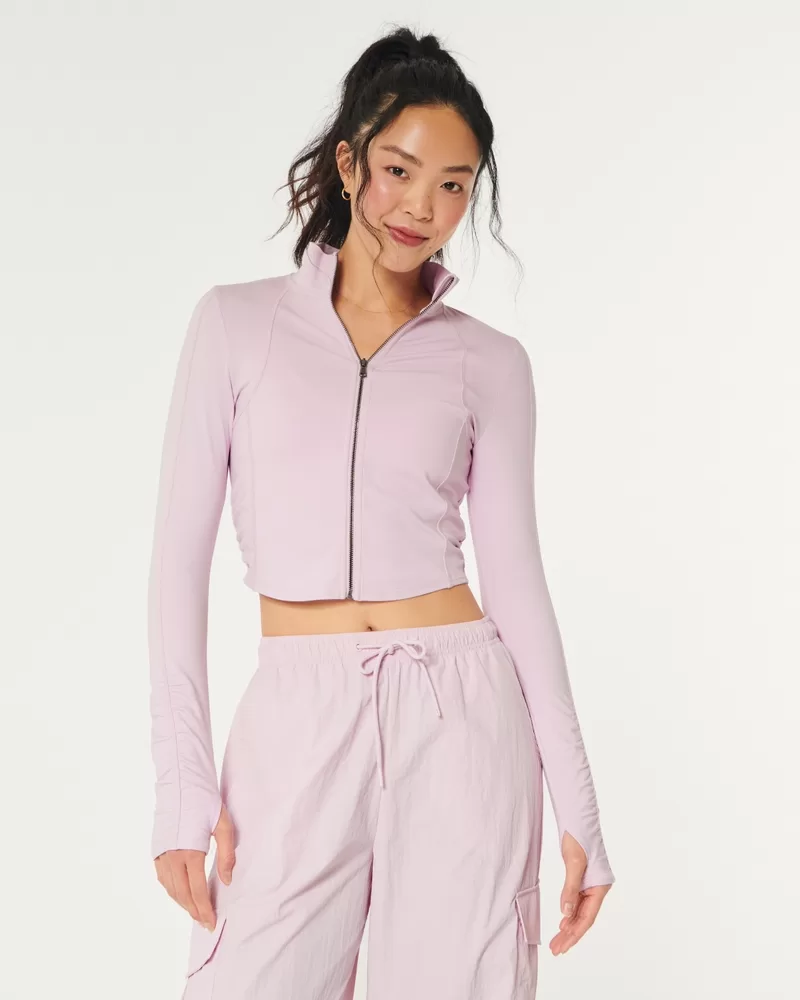 Designed in our breathable, 4-way stretch, moisture-wicking Recharge fabric with a super soft, brushed feel. Zip-up closure, long sleeves. Cinched detailing at the sleeves, seam detailing, thumb openings, cropped length. Imported.