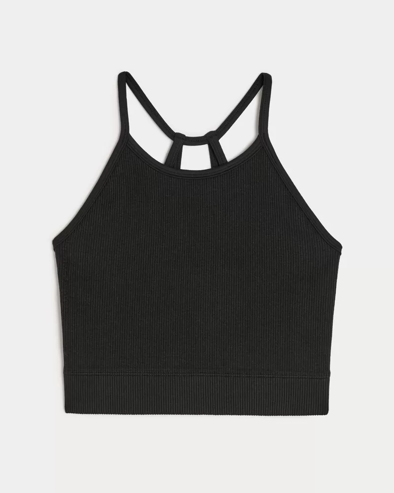 An ultra-comfy tank made with super soft ribbed fabric with a seamless look and feel. High-neckline, strappy back. Imported.
