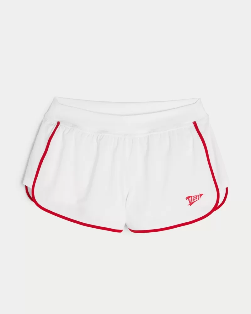 Cute and comfy running shorts with a sporty USA pendant print graphic and tipped trims. Inner shorts lining with pocket, banded low-rise waist. Imported.