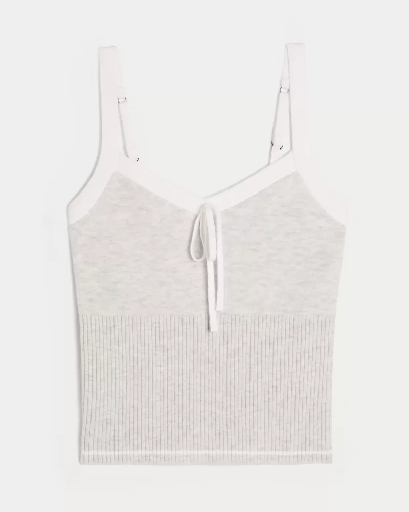 A cozy and super soft sweater-knit tank with a pretty tie detail at the neckline and adjustable straps. Ribbed hem. Imported.