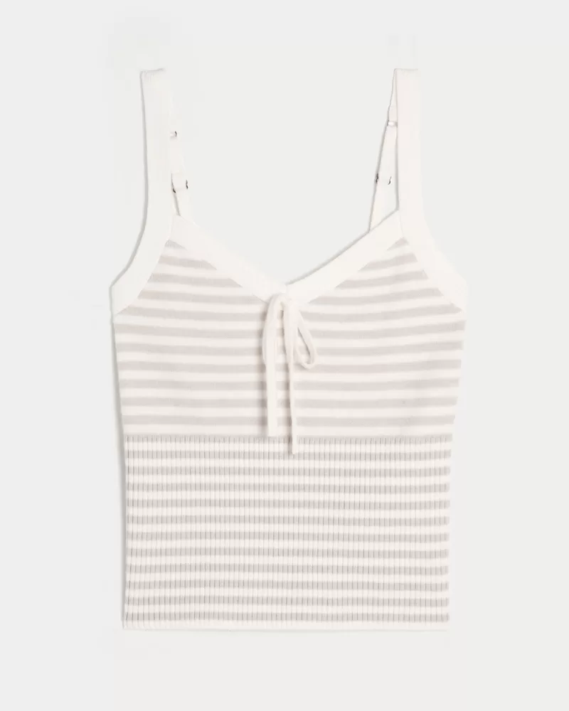 A super soft sweater-knit tank with a pretty tie detail at the center neckline. Ribbed hem, adjustable straps.