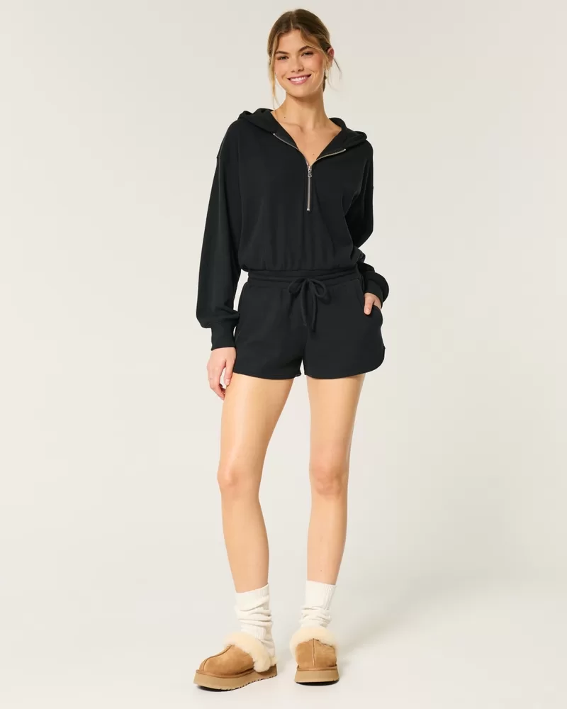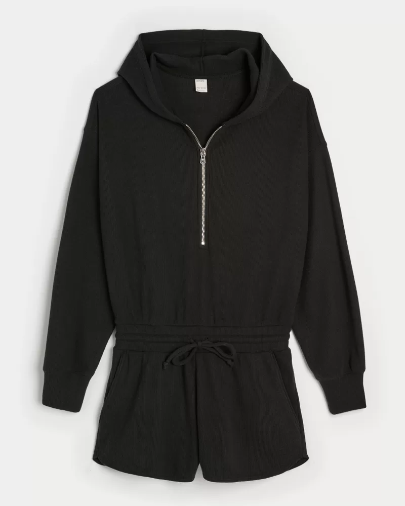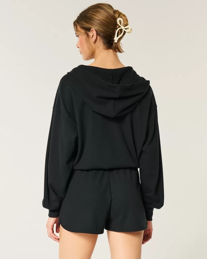 A super soft onesie in cozy waffle fabric. Drawstring waist, shorts, pockets, hood with zipper closure, long sleeves with banded cuffs. Imported.