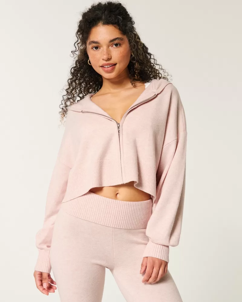 A cozy hoodie in super soft sweater-knit fabric. Full zip-up closure, long sleeves, ribbed trims, hood. Imported.