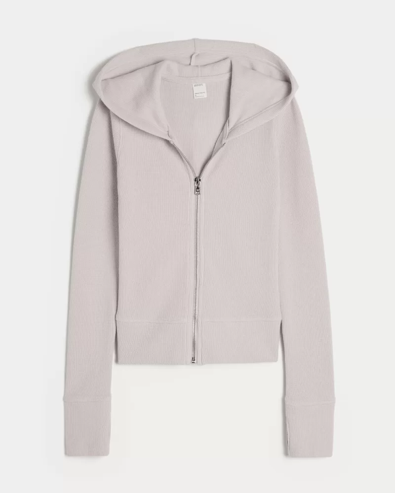 A cute and cozy hoodie in super soft waffle fabric. Full zip-up closure, hood, long sleeves with thumb openings. Slim Fit. Imported.