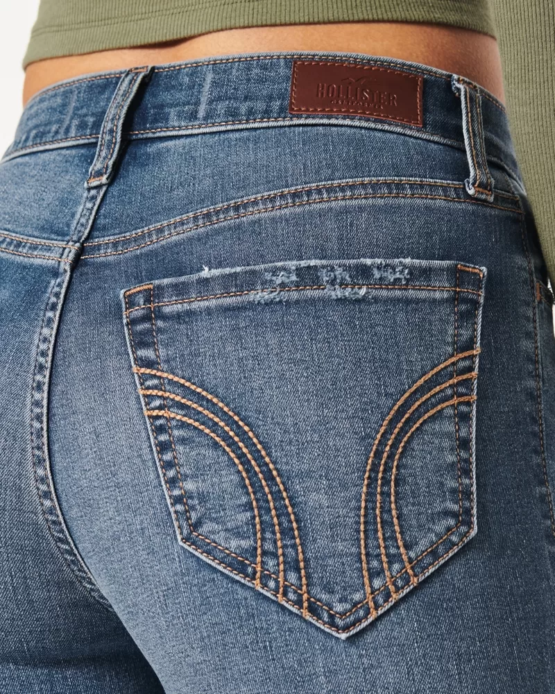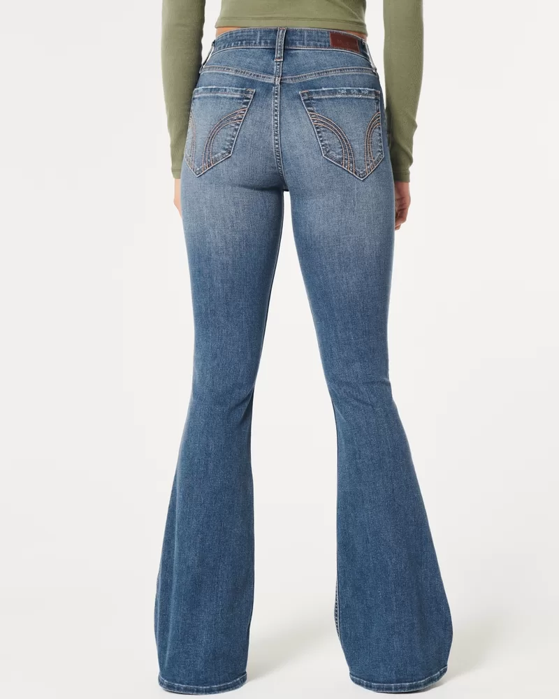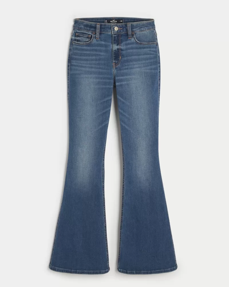 High-rise denim jeans in a medium wash with a vintage-inspired flared leg. Fading and whiskering. Made with stretch. Imported.