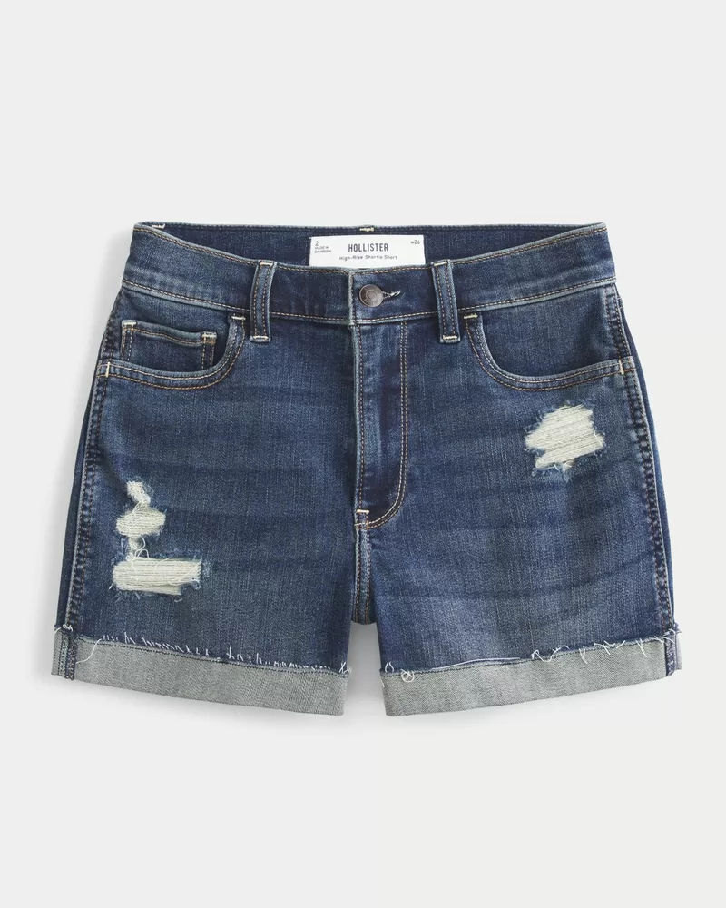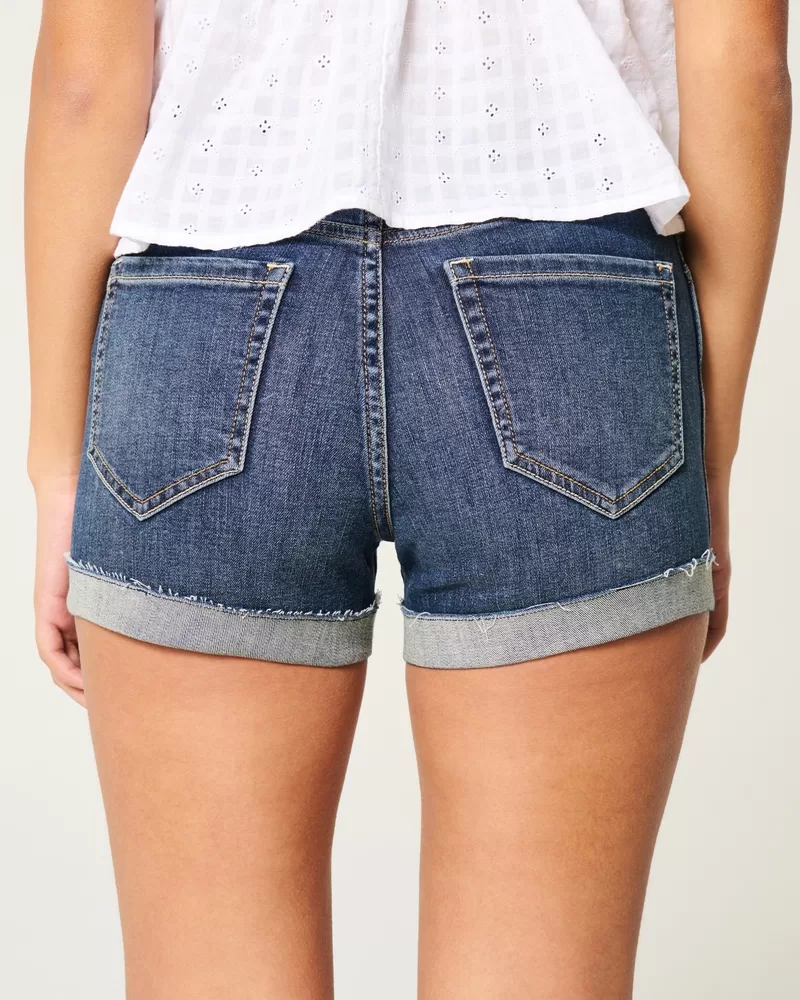Cute denim shortie shorts designed with a flattering high-rise waist. Dark wash with fading, whiskering and ripped details. Cuffed hems, super comfortable Soft Stretch denim.