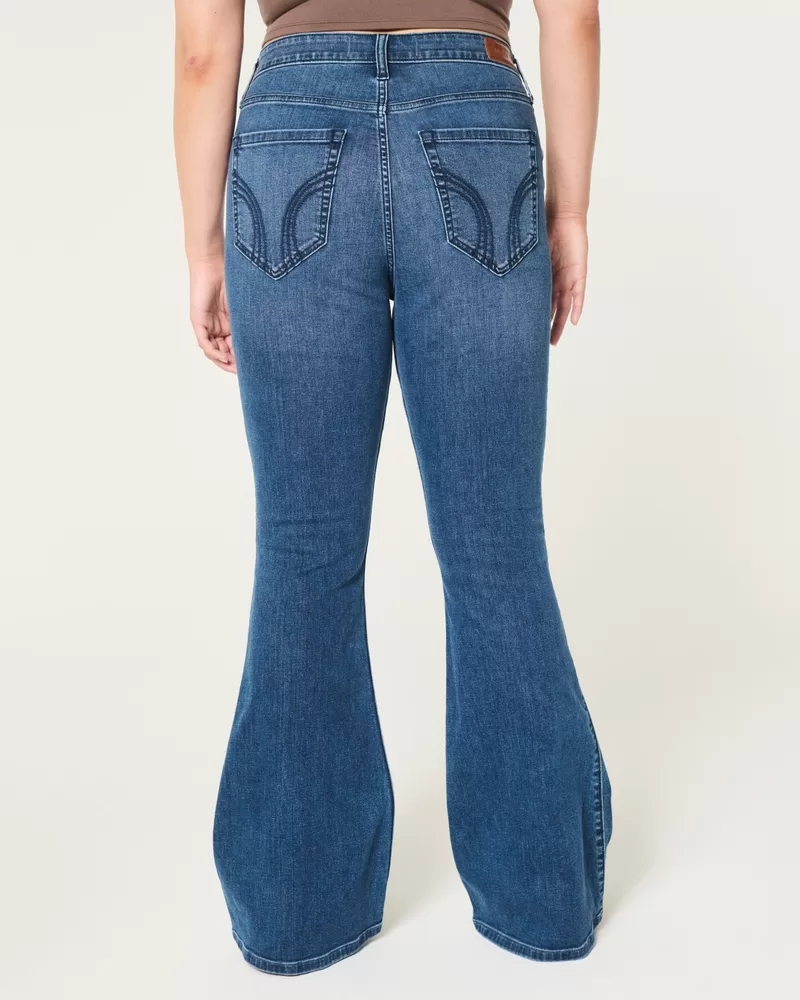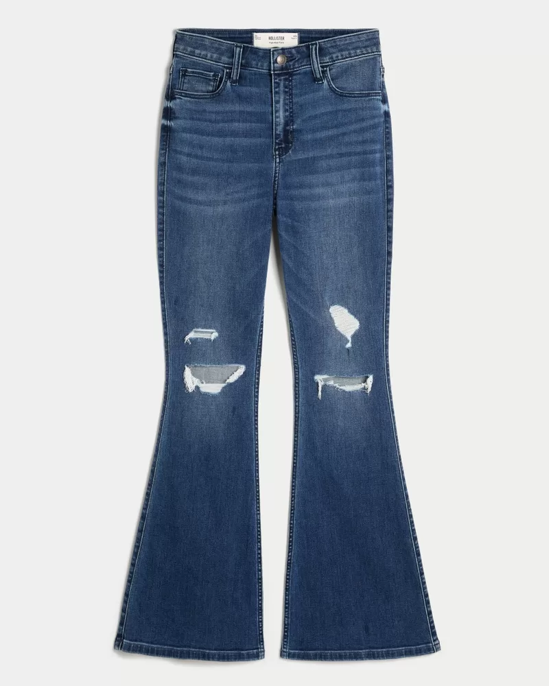 Cute and comfy jeans with stretch in a medium wash with fading, whiskering and ripped detailing. Slim through the leg with a flared hem, high-rise waist. Imported.