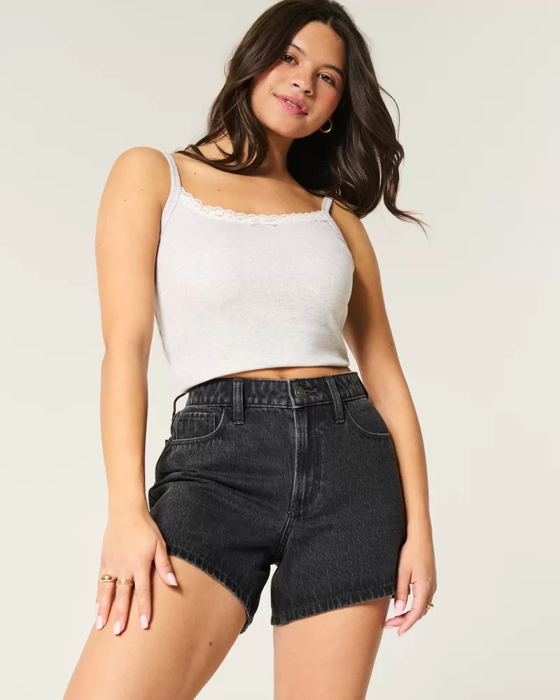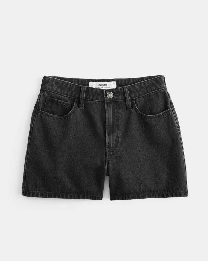Cute and comfy denim shorts designed with a flattering high-rise waist and relaxed fit. Washed black, 5″ inseam. Imported.