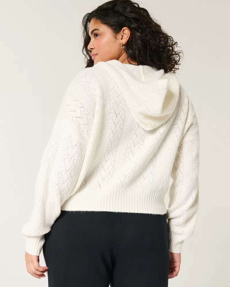 Cute and cozy, this super soft sweater hoodie features stitchy texture and all-over patterns. Full zip-up closure, hood, ribbed trims, long sleeves. Easy Fit. Imported.