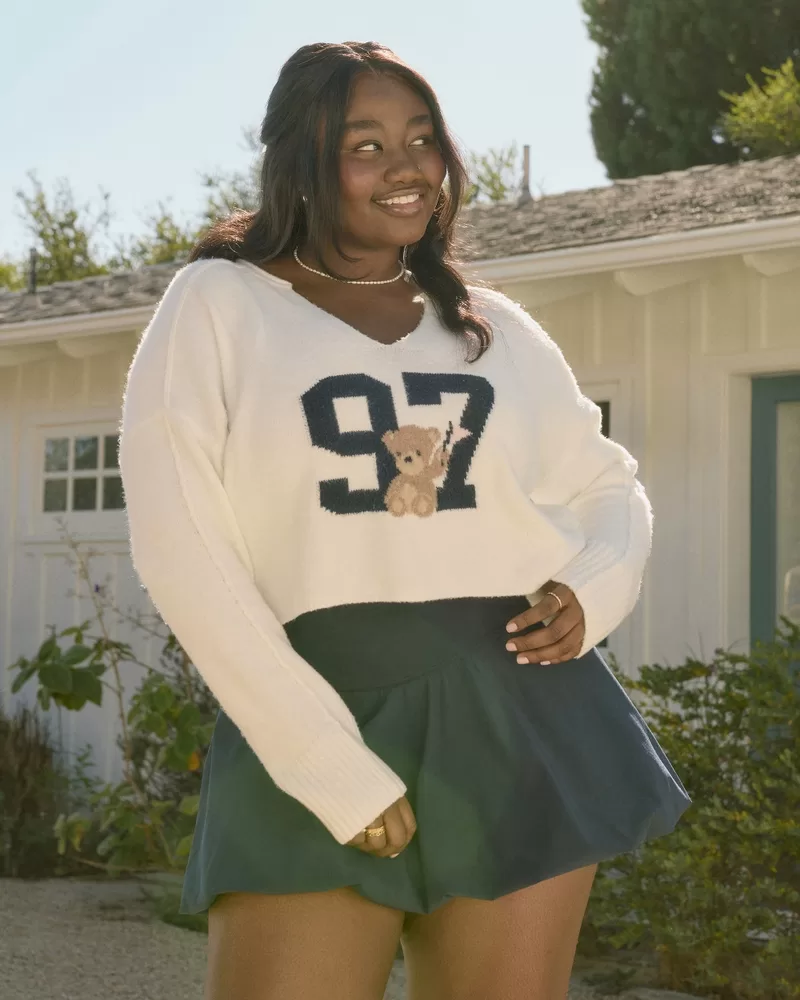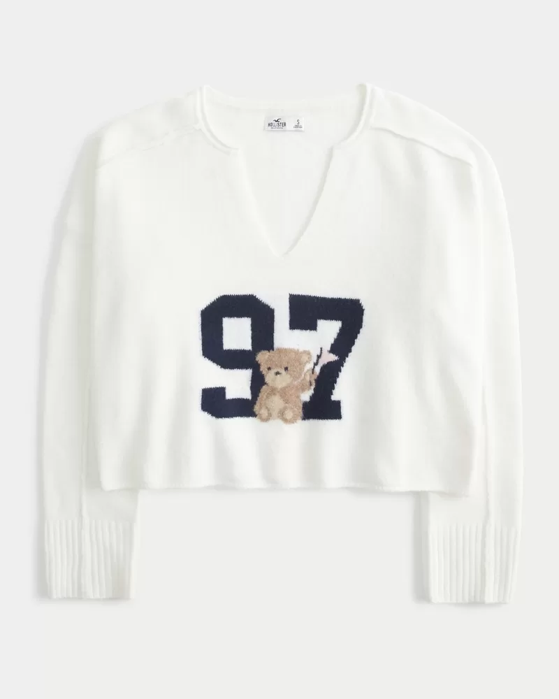Super soft and comfy, this sweater features a 97 number intarsia graphic with a cute teddy bear detail. Notch neckline, long sleeves with ribbed hems.