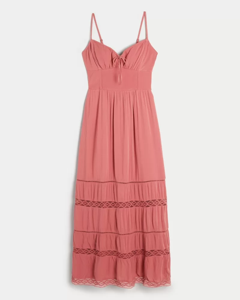 This super cute and ultra-soft maxi-length dress features flattering side smocking, ruched detailing at the bust and a center tie detail at the neckline. Tiered skirt with pretty lace detailing, adjustable straps, sweetheart neckline, pockets. Imported.