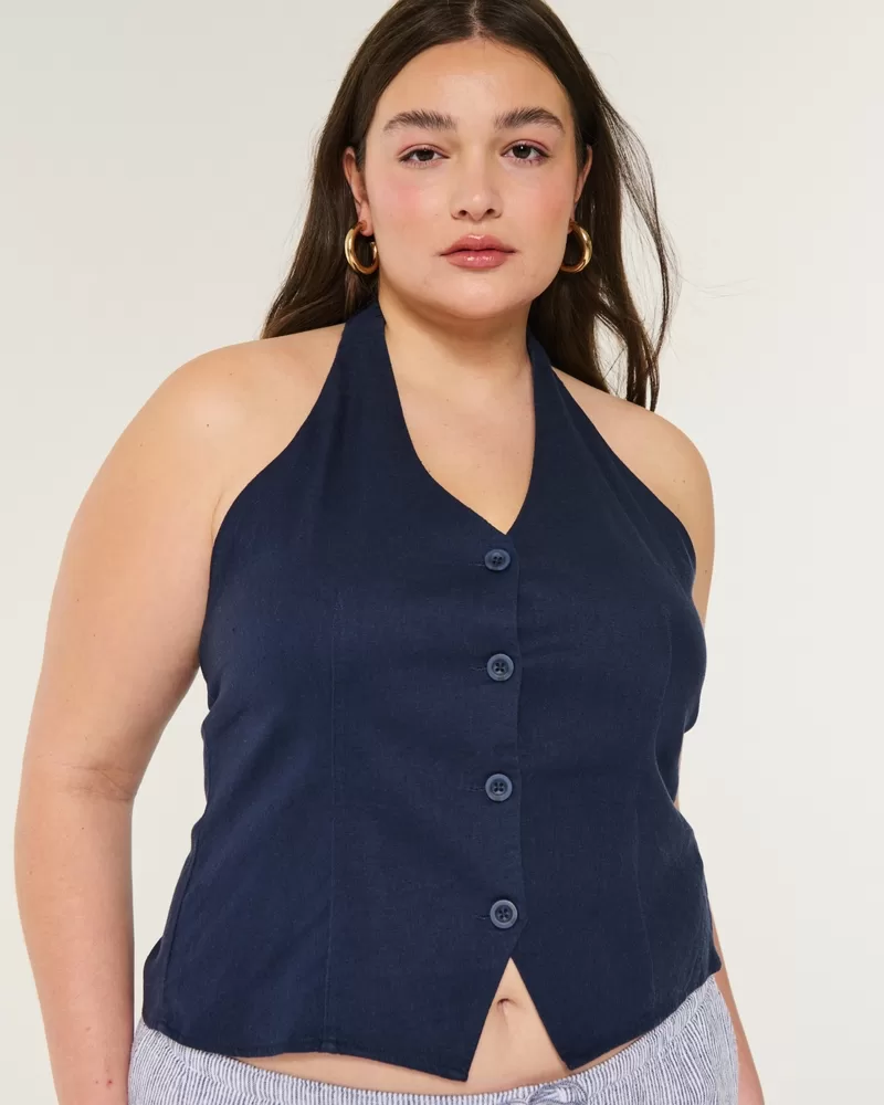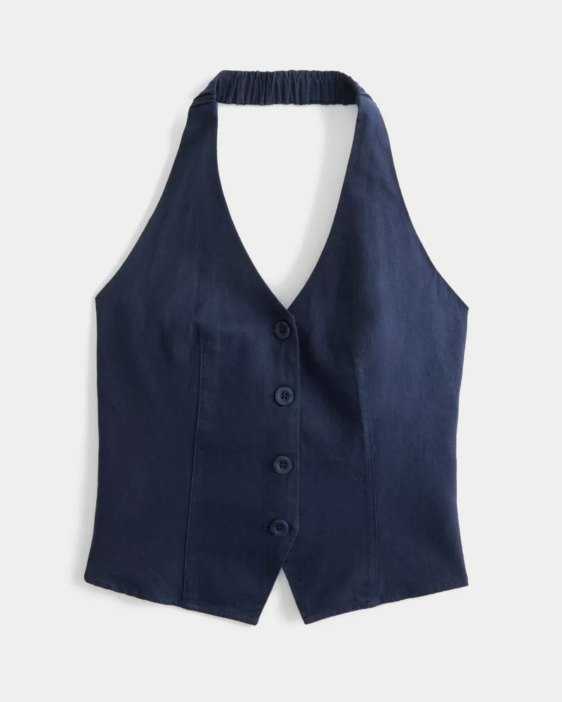 A pretty vest that’s perfect for warmer weather! Soft linen-blend fabric, open back, button closure, halter straps, tie-back bow, tailored look. Slim Fit.