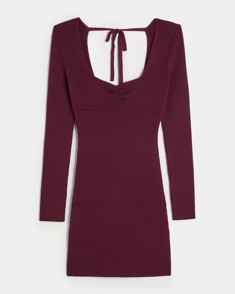 Long-Sleeve Cinch Bust Open-Back Sweater Dress