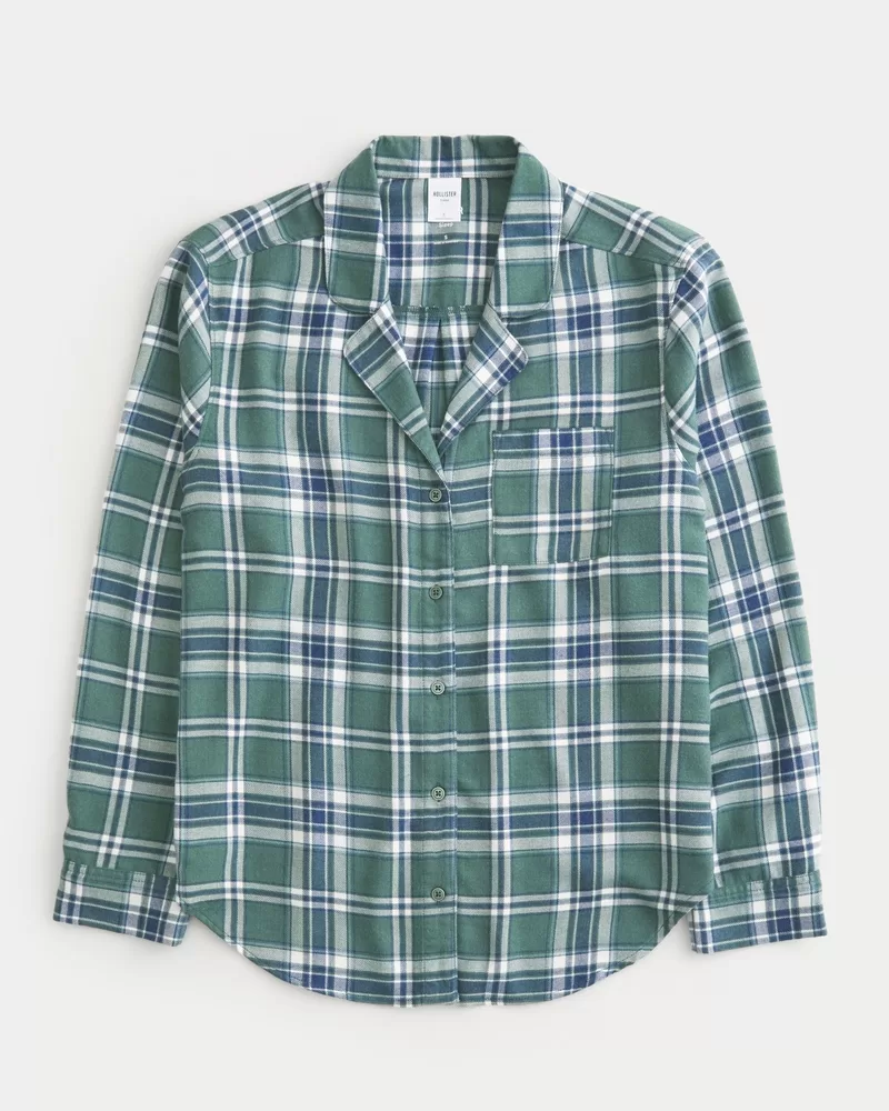 A cozy and super soft flannel sleep shirt with a full button closure, collar and left chest pocket. Curved hem. Easy Fit. Imported.