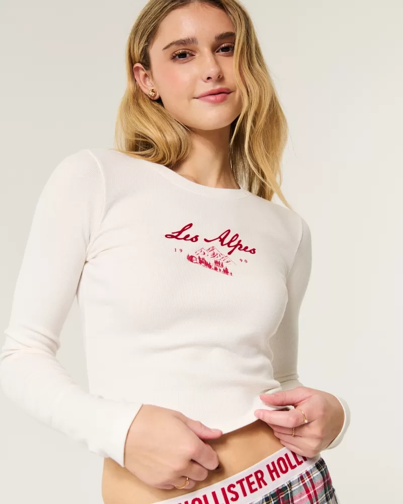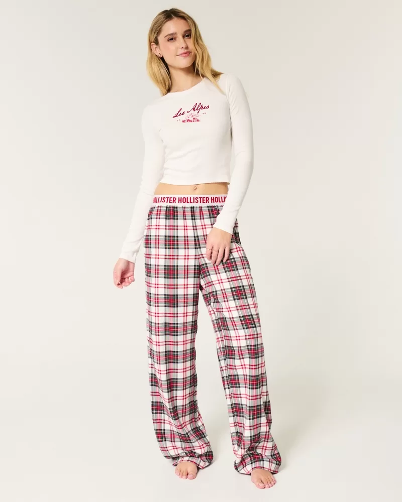 Includes a super soft long-sleeve tee in ribbed fabric with Les Alps print graphics and flocking, plus flannel pajama pants with a banded waist with logo details and pockets. Imported.