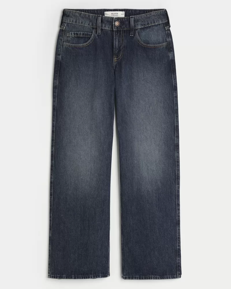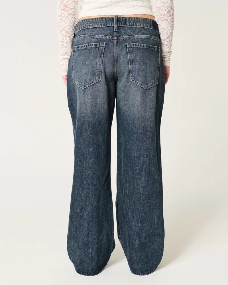 Comfortable denim jeans designed with a low-rise waist and baggy leg. Dark wash with fading. Imported.