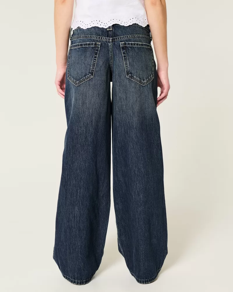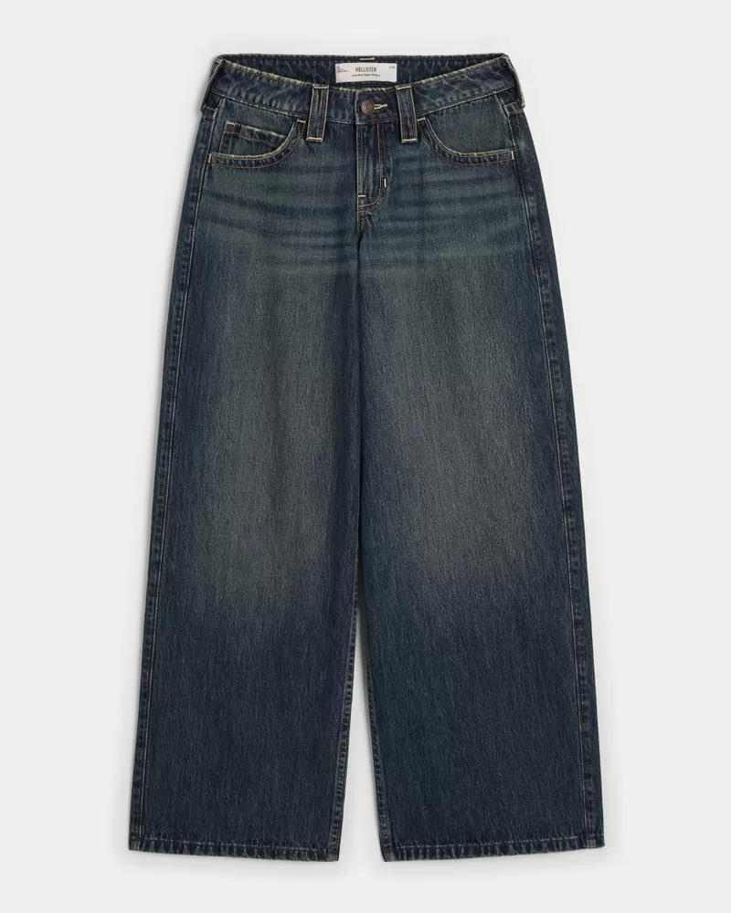 Cute and comfortable jeans in a dark wash with fading and whiskering, designed with a flattering low-rise waist and super baggy leg. Imported.