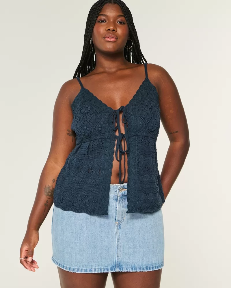 This cute denim mini skort features hidden knit shorts and a low-rise waist. Imported.