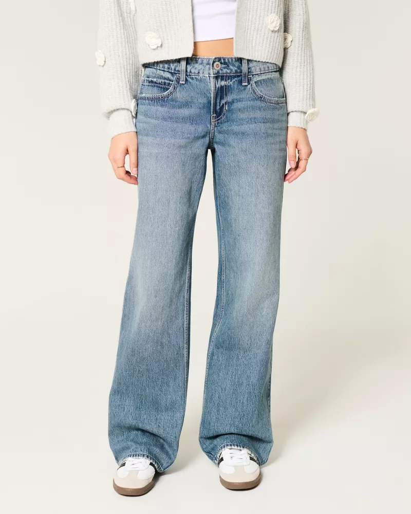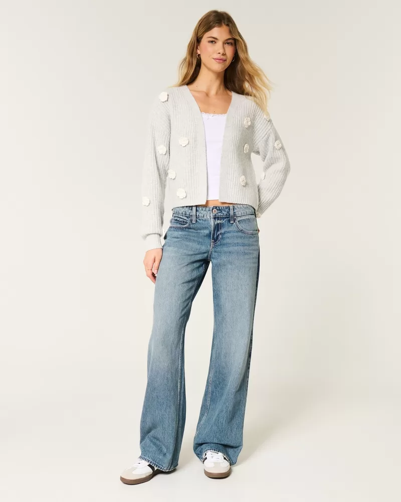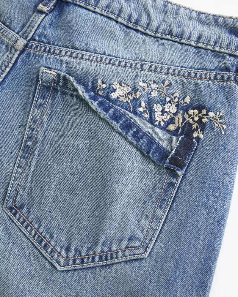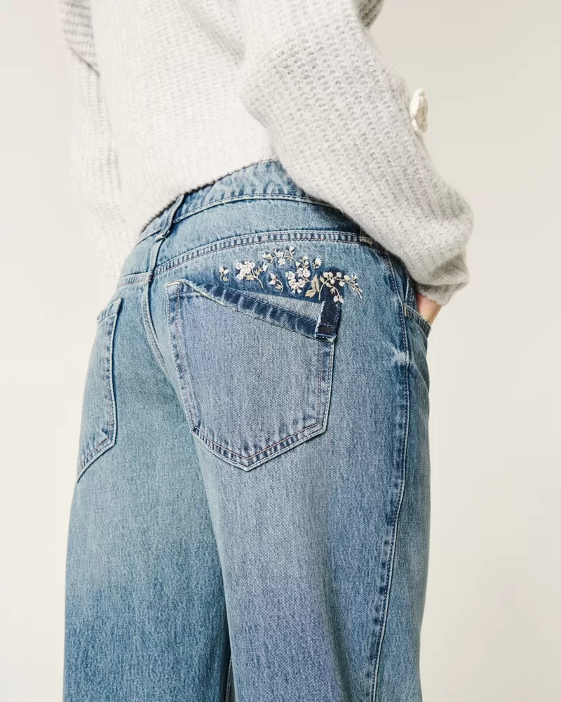 Low-Rise Floral Embroidered Medium Wash Baggy Jeans