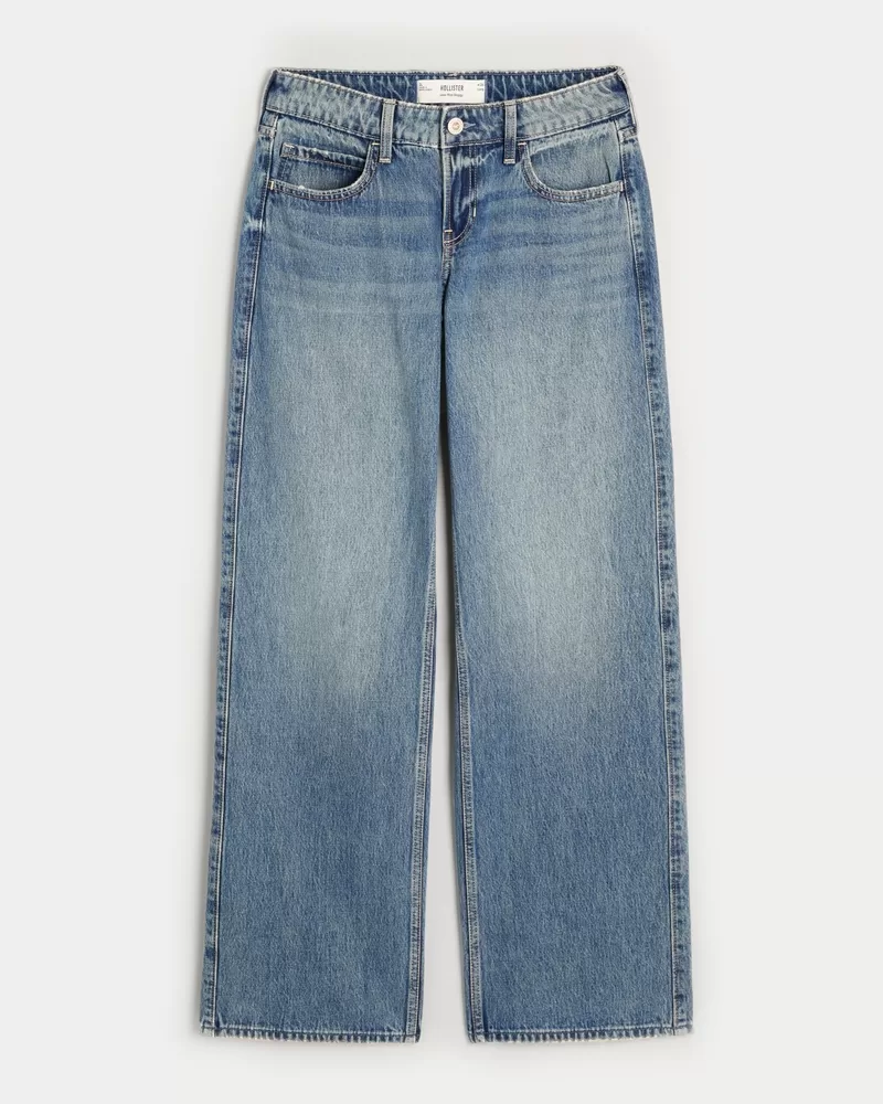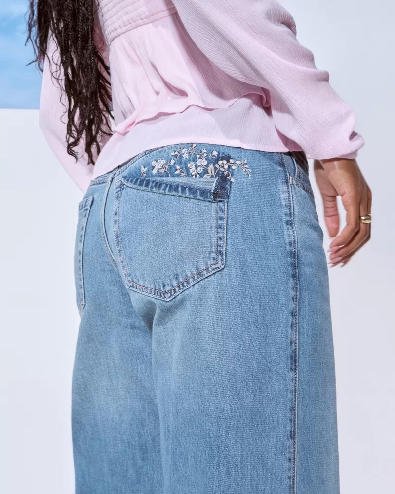 Ultra-comfortable denim jeans in a medium wash. Fading, whiskering, low-rise waist, folded back pocket with embroidered floral details. Baggy leg. Imported.