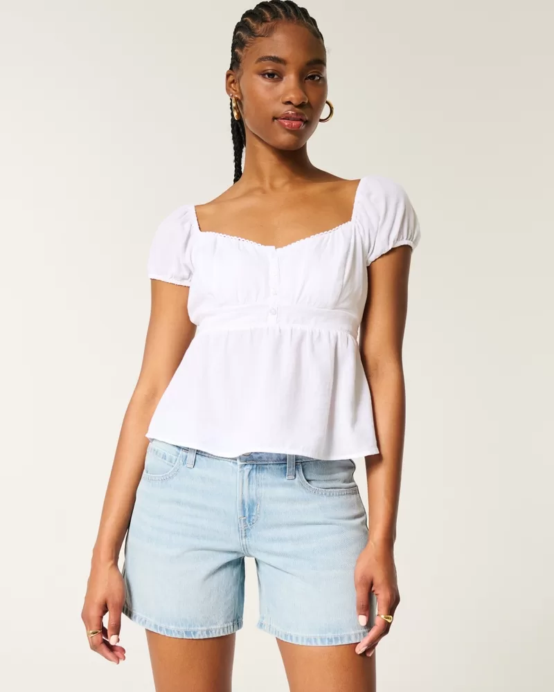 Cute and comfy denim carpenter shorts in a light wash, designed with a low-rise waist and baggy fit. Left hammer loop, 5″ inseam. Imported.