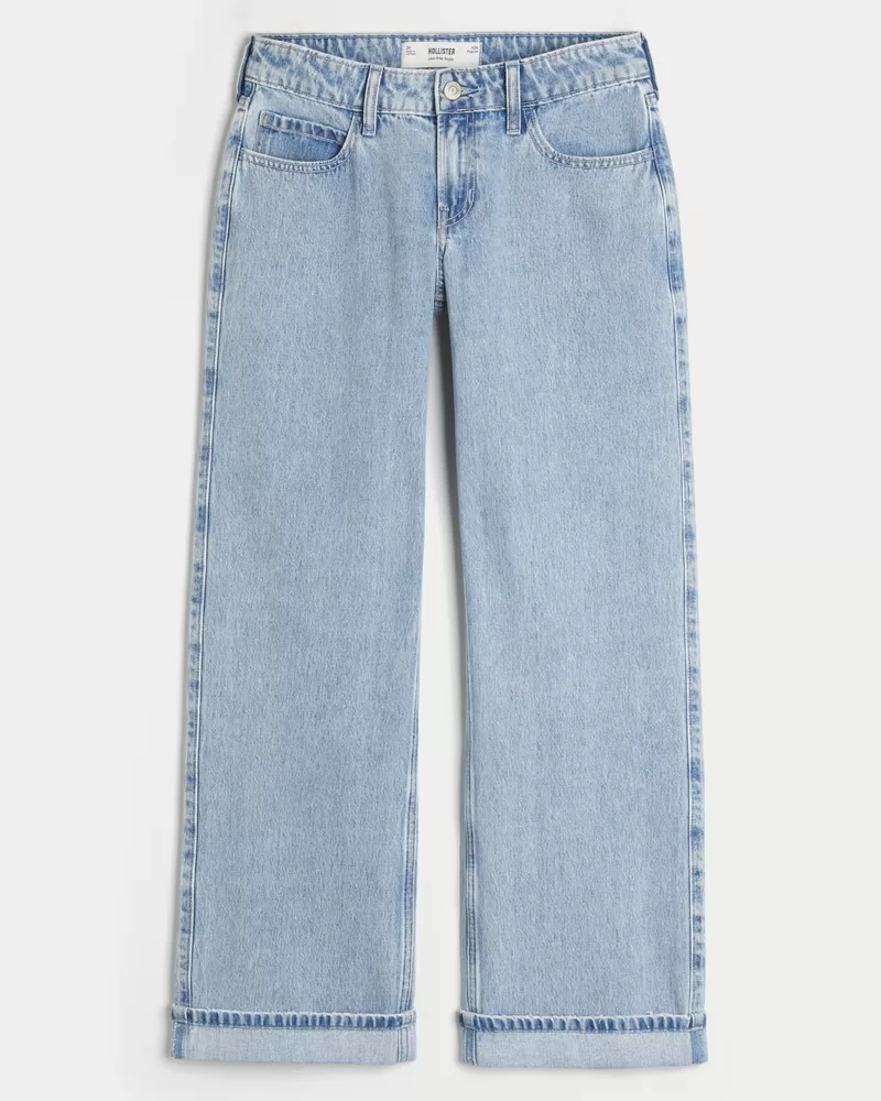 Cute and comfortable jeans in a light wash, designed with a flattering low-rise waist and baggy leg. Cuffed hems. Imported.