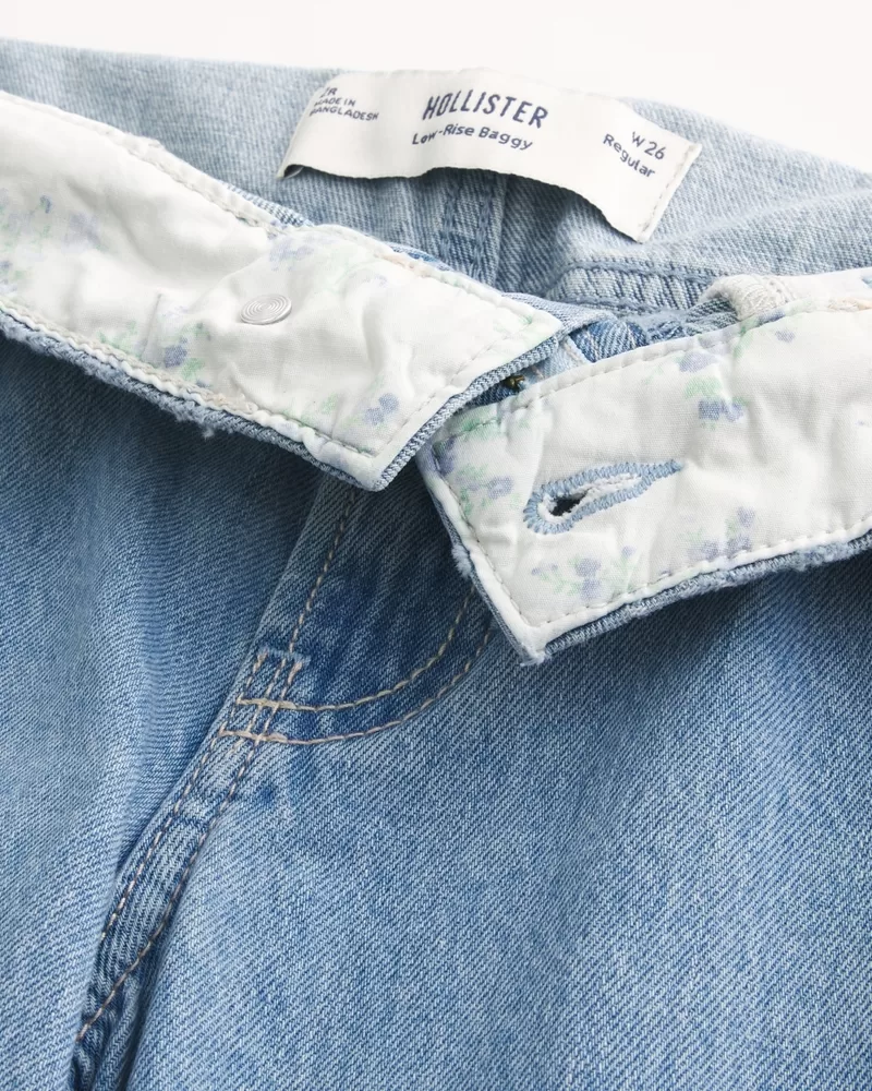 Cute and comfortable jeans in a light wash, designed with a flattering low-rise waist and baggy leg. Foldover waistband with floral patterns. Imported.