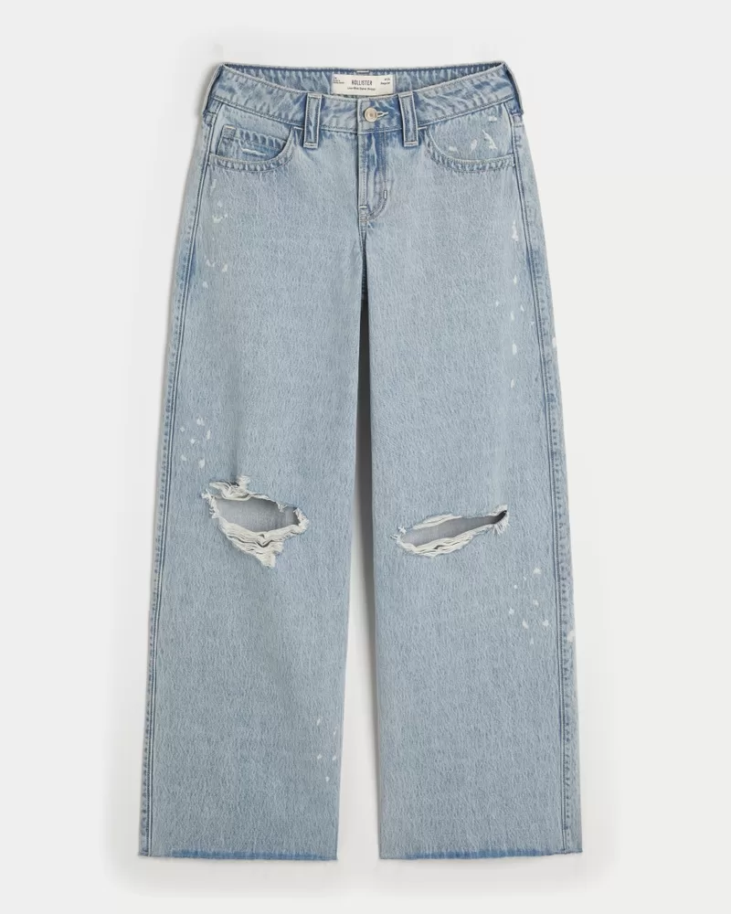 Comfortable denim jeans in a light wash, designed with a super baggy leg and flattering low-rise waist. Ripped details, paint splatter details. Imported.