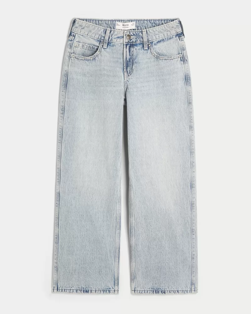 Comfortable denim jeans in a light wash, designed with a flattering low-rise waist and baggy leg. Fading, whiskering, stud details at back pockets. Imported.