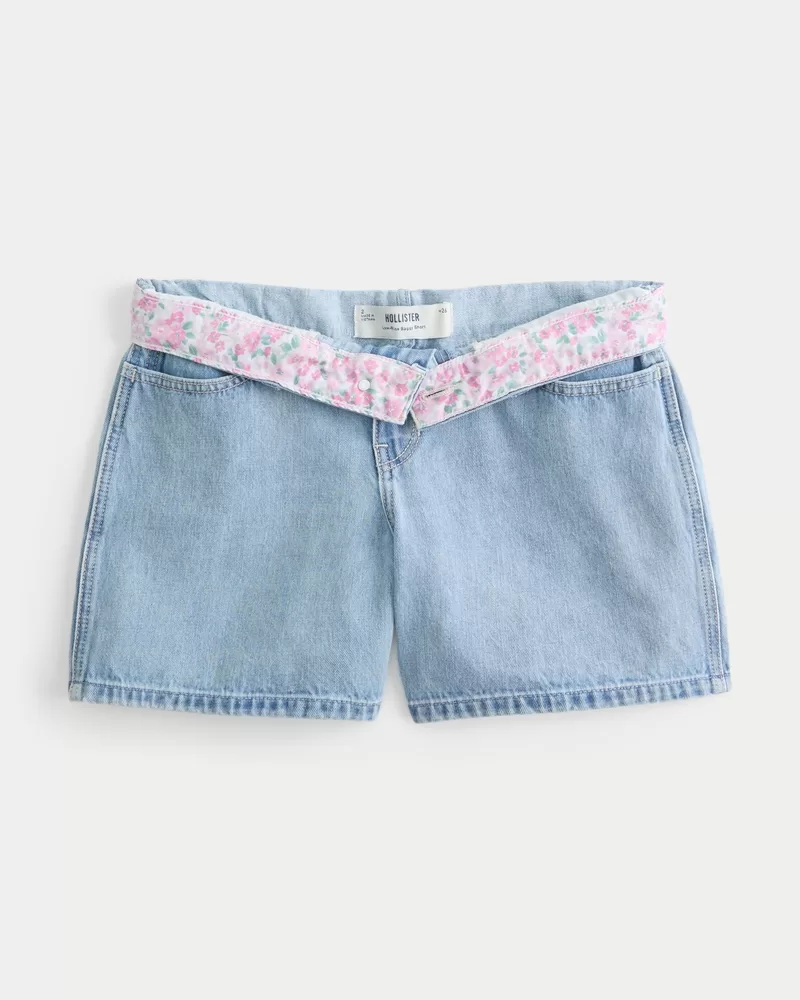 Cute and comfy denim shorts designed with a low-rise waist and baggy leg. Medium wash, floral interior waist pattern, 5″ inseam. Imported.