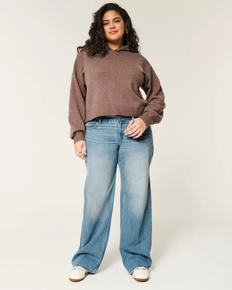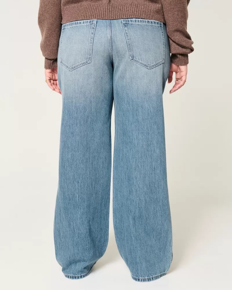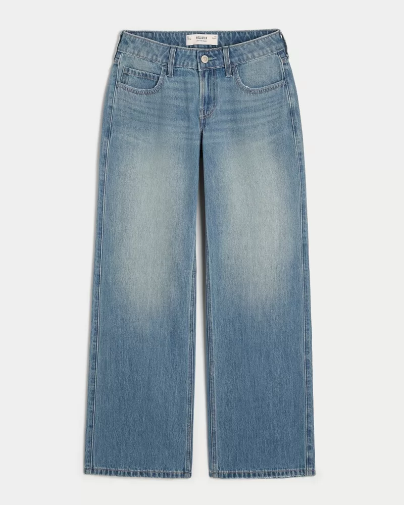 Ultra-comfortable denim jeans designed with a low-rise waist and baggy leg. Medium wash, fading and whiskering. Imported.