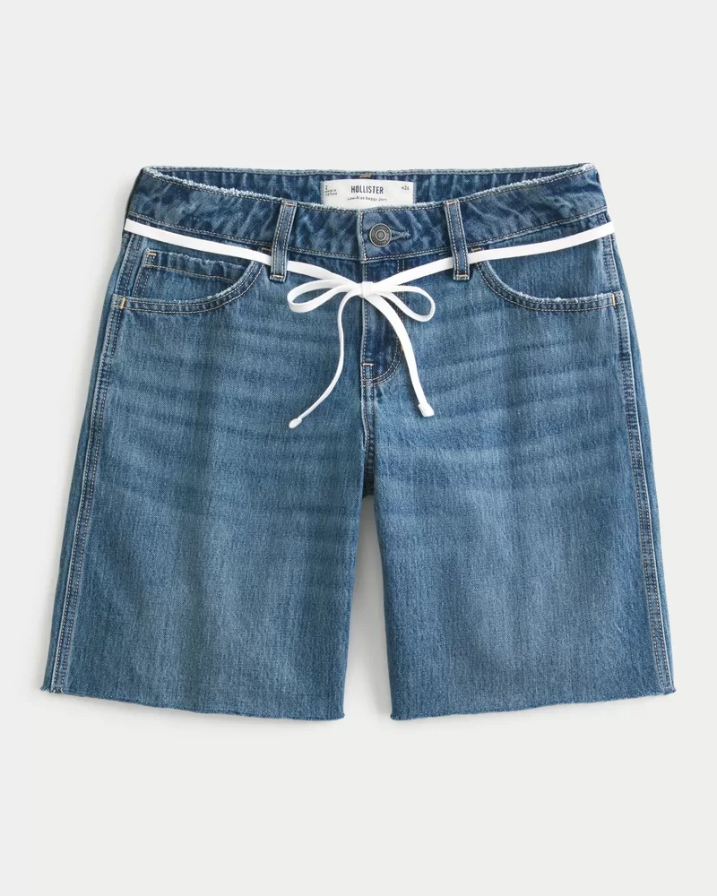 Cute and comfy denim shorts designed with a low-rise waist and baggy fit. Medium wash with fading and whiskering. Shoelace at waist. Imported.