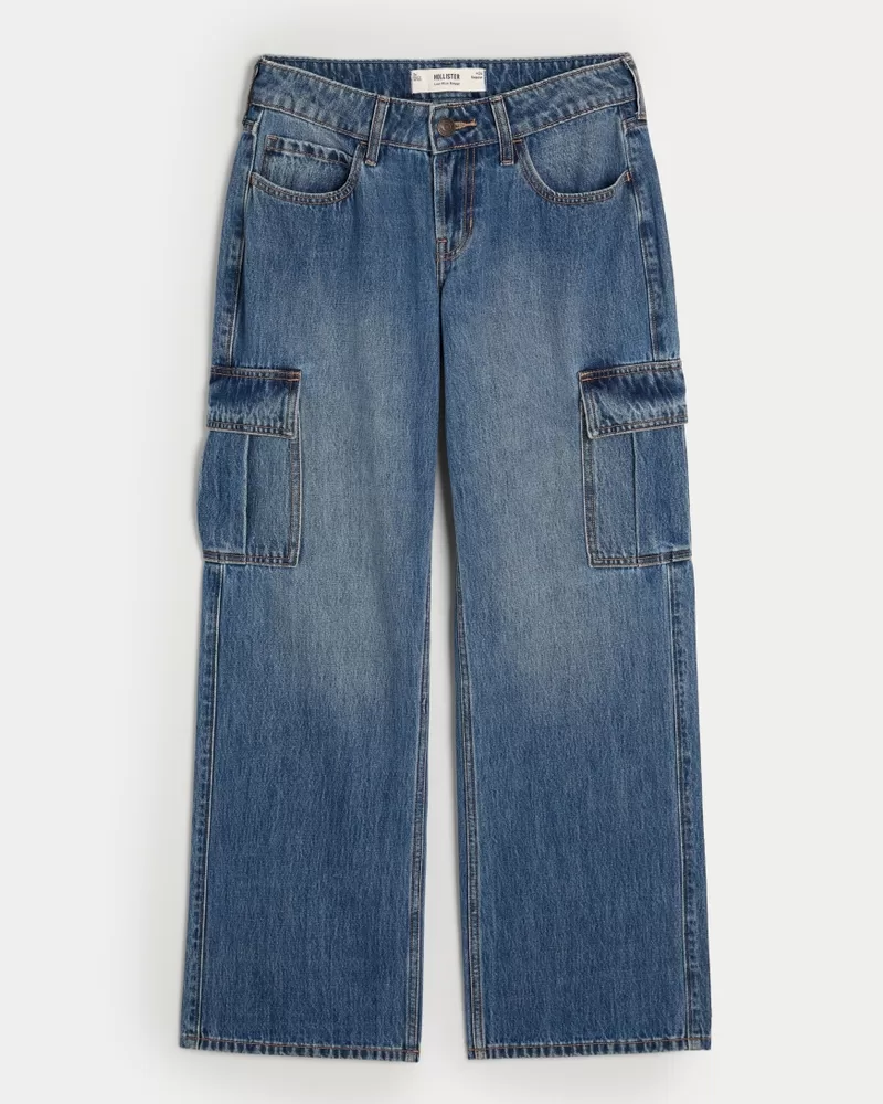 Ultra-comfortable jeans in a medium wash, designed with a baggy leg. Fading, low-rise waist, side cargo pockets.