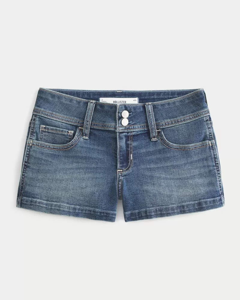 Cute and comfy denim shortie shorts in a medium wash with fading and whiskering. Low-rise waist. Imported.