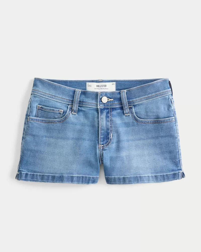 Cute and comfy denim shortie shorts in a medium wash, designed with a flattering low-rise waist. Fading, whiskering. Imported.