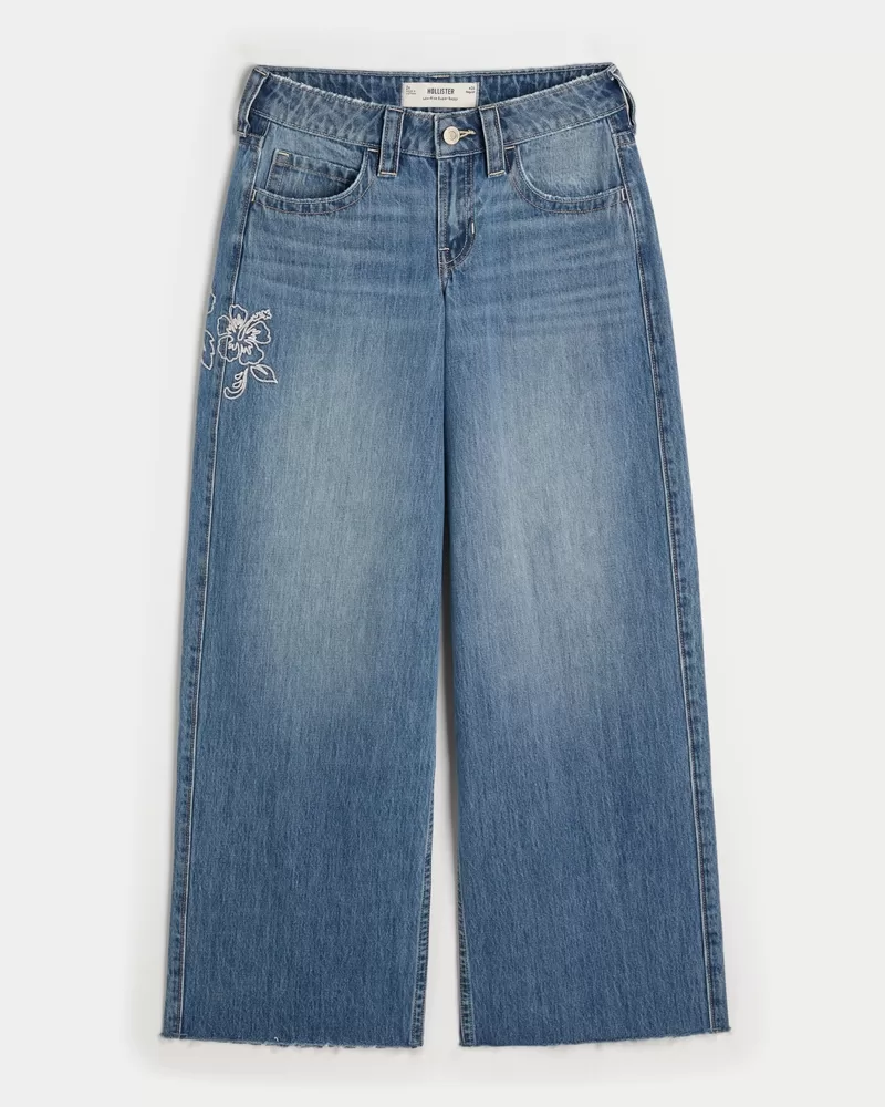 Low-Rise Medium Wash Floral Embroidery Super Baggy Jeans