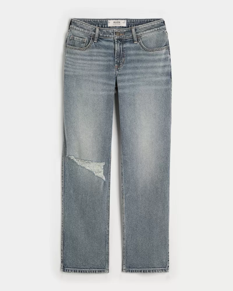 Classic jeans in a medium wash, designed with a straight leg and low-rise waist. Vintage Stretch denim with ripped details, fading and whiskering. Imported.