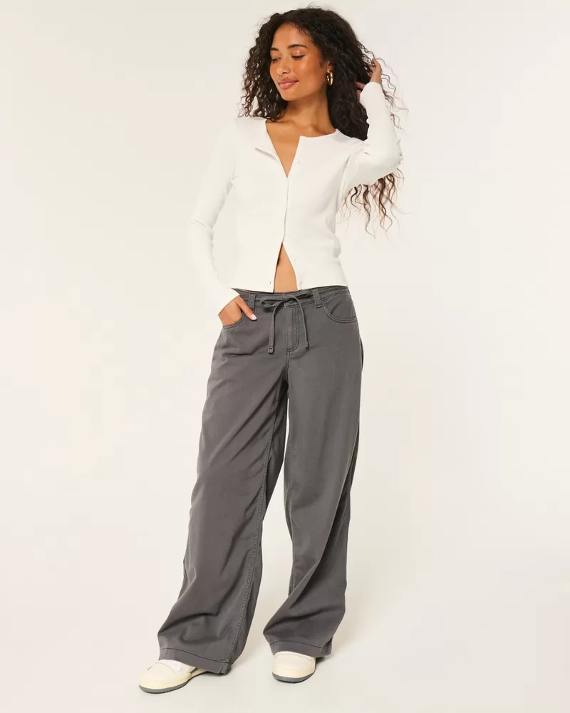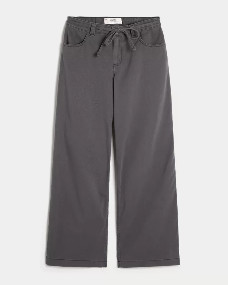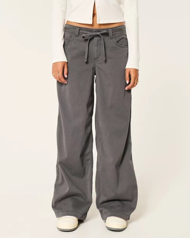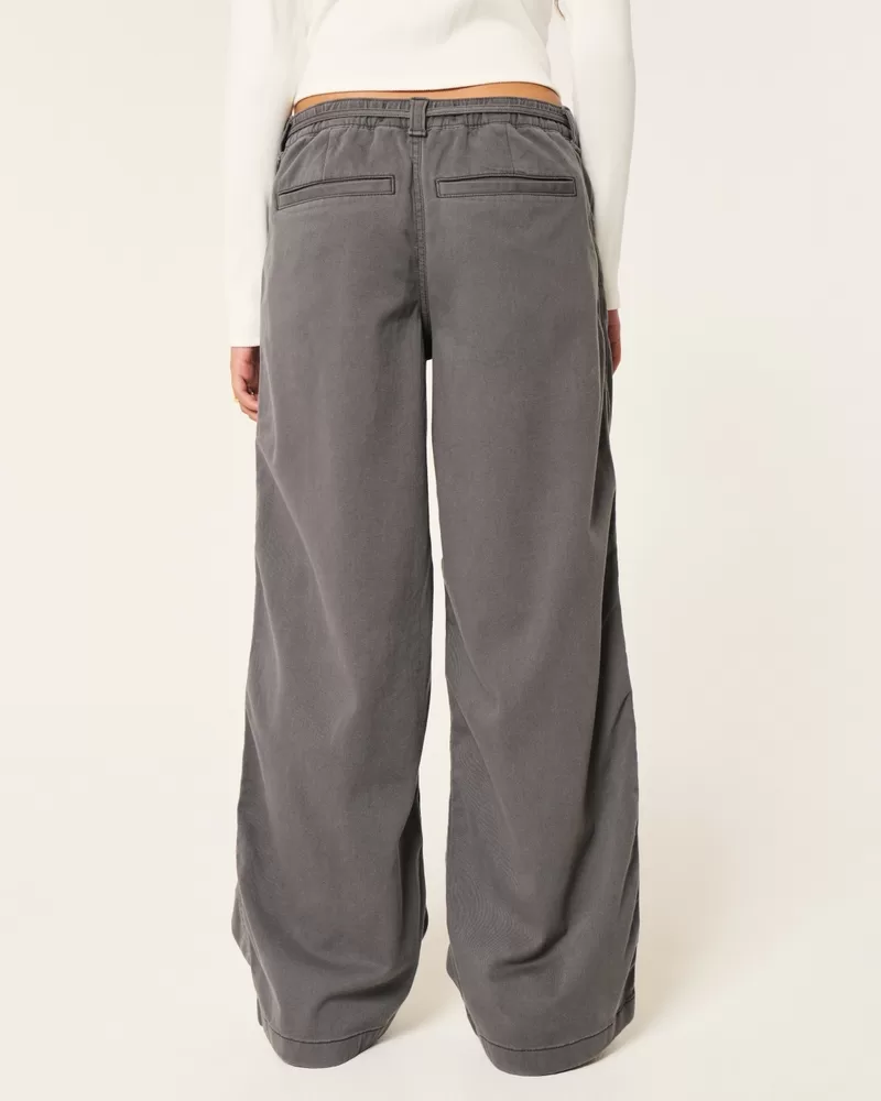 Soft twill pants designed with a flattering low-rise drawstring waist. Zipper closure, pockets, super baggy leg. Imported.