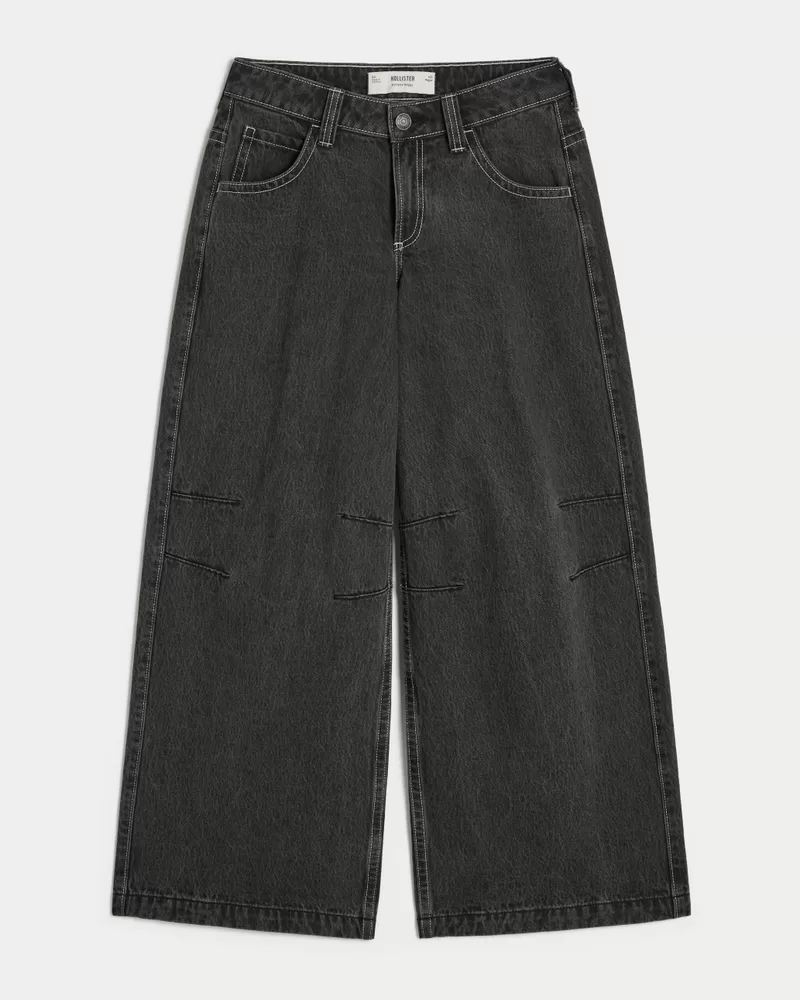 Your new fave jeans are designed with a low-rise waist and extreme baggy leg. Washed black, stitched knee darts. Imported.