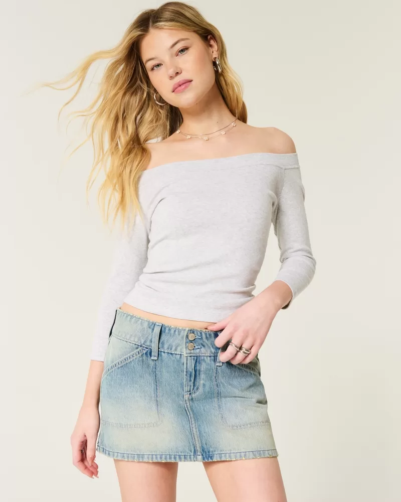 A cute and comfy Y2K-inspired denim mini skort with chop pockets and back flap pockets. Hidden shorts, low-rise waist, fading. Imported.