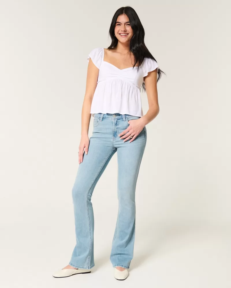 Cute and comfortable jeans in a light wash, designed with a flattering mid-rise waist, slim leg and boot hem. Fading and whiskering, Soft Stretch denim.