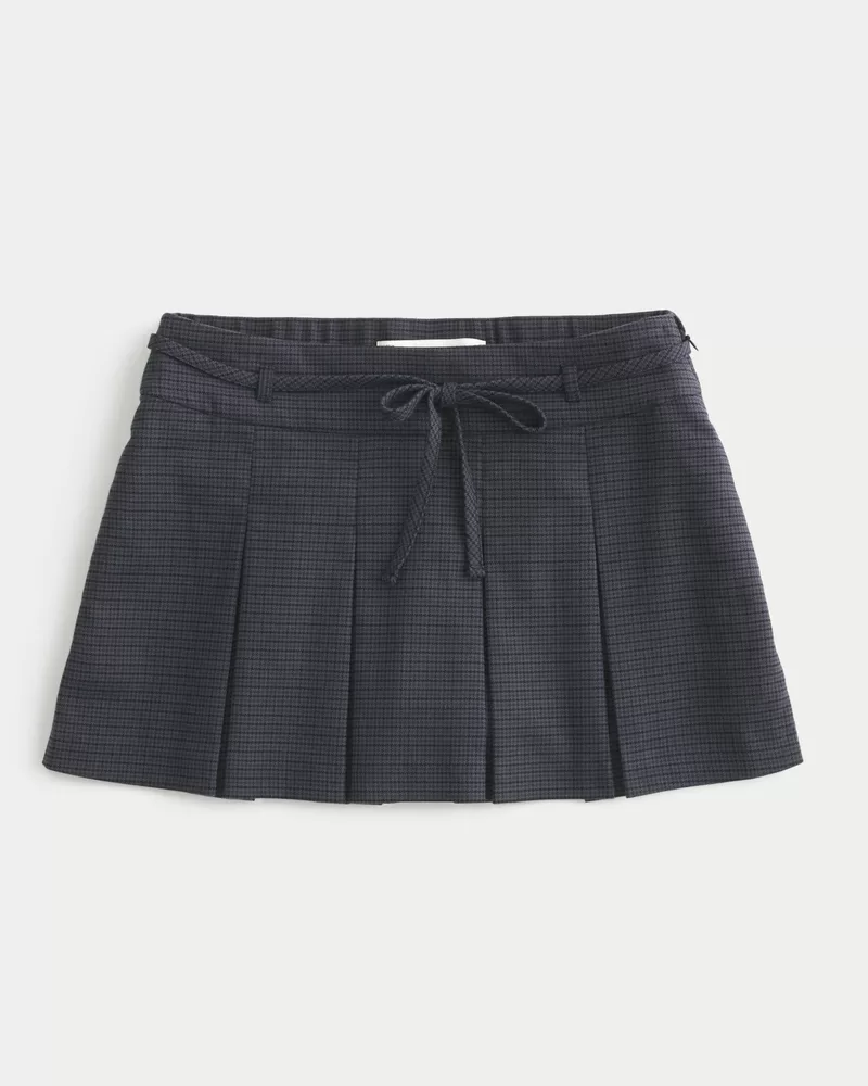 This cute mini skort features a tie waist, hidden shorts and classic pleats. Mid-rise waist, pockets.